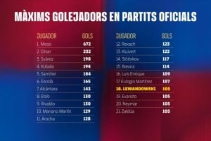 本周日的比赛同时达成了蒙锥克球场百球里程碑。此役前巴萨已在此打入99粒进球,孔德的破门成为蒙锥克球场第100球。莱万攻入第第101球,他以24球成为俱乐部在该球场的历史射手王,拉菲尼亚以15球位列次席。