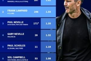 德国转会市场盘点了英格兰“黄金一代”球员在教练岗位上的执教战绩,杰拉德以场均1.82分居首,兰帕德以场均1.55分位居次席。